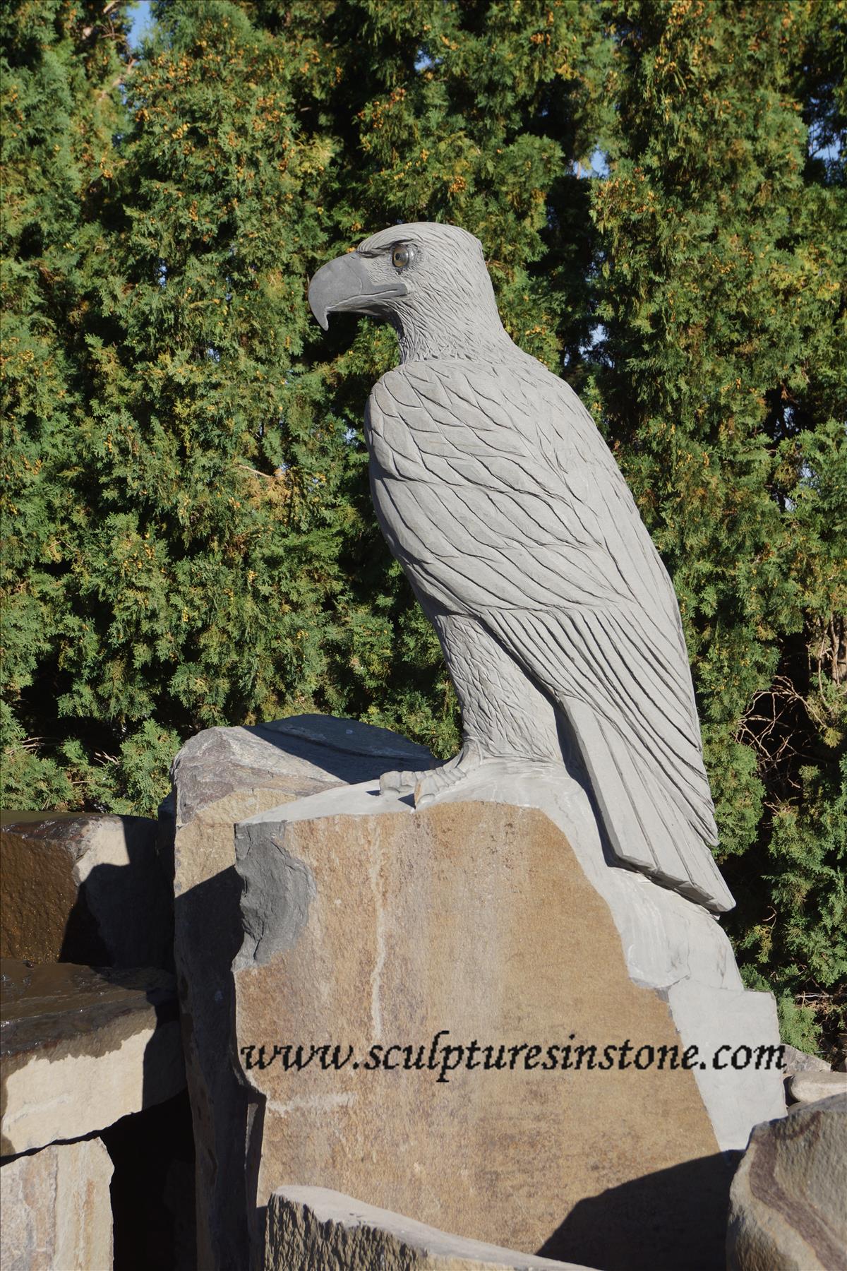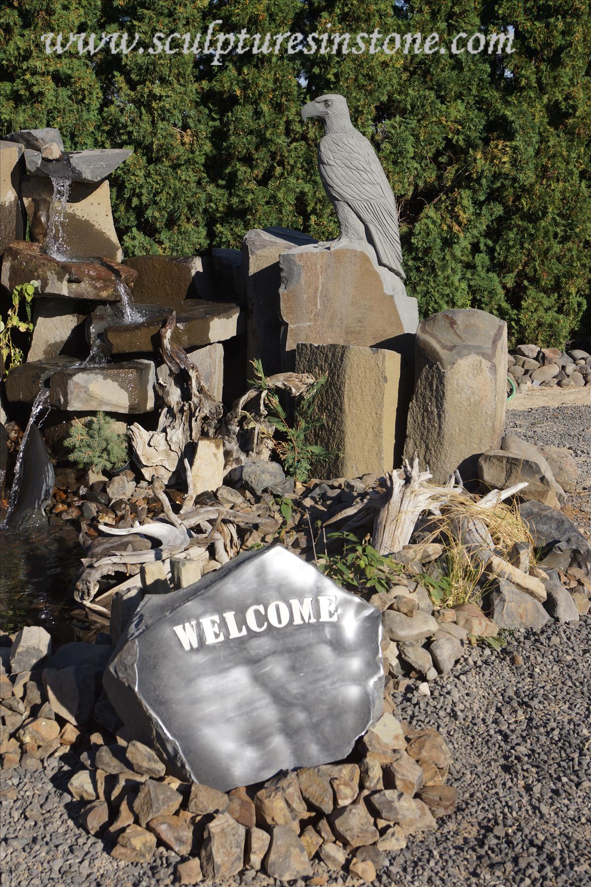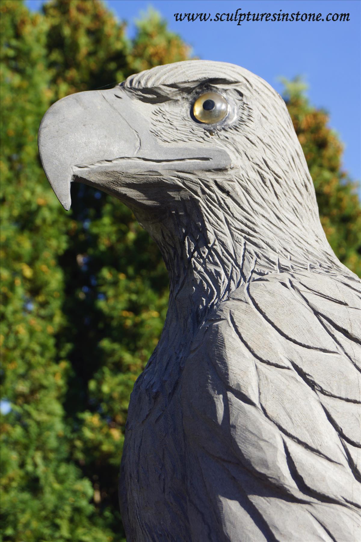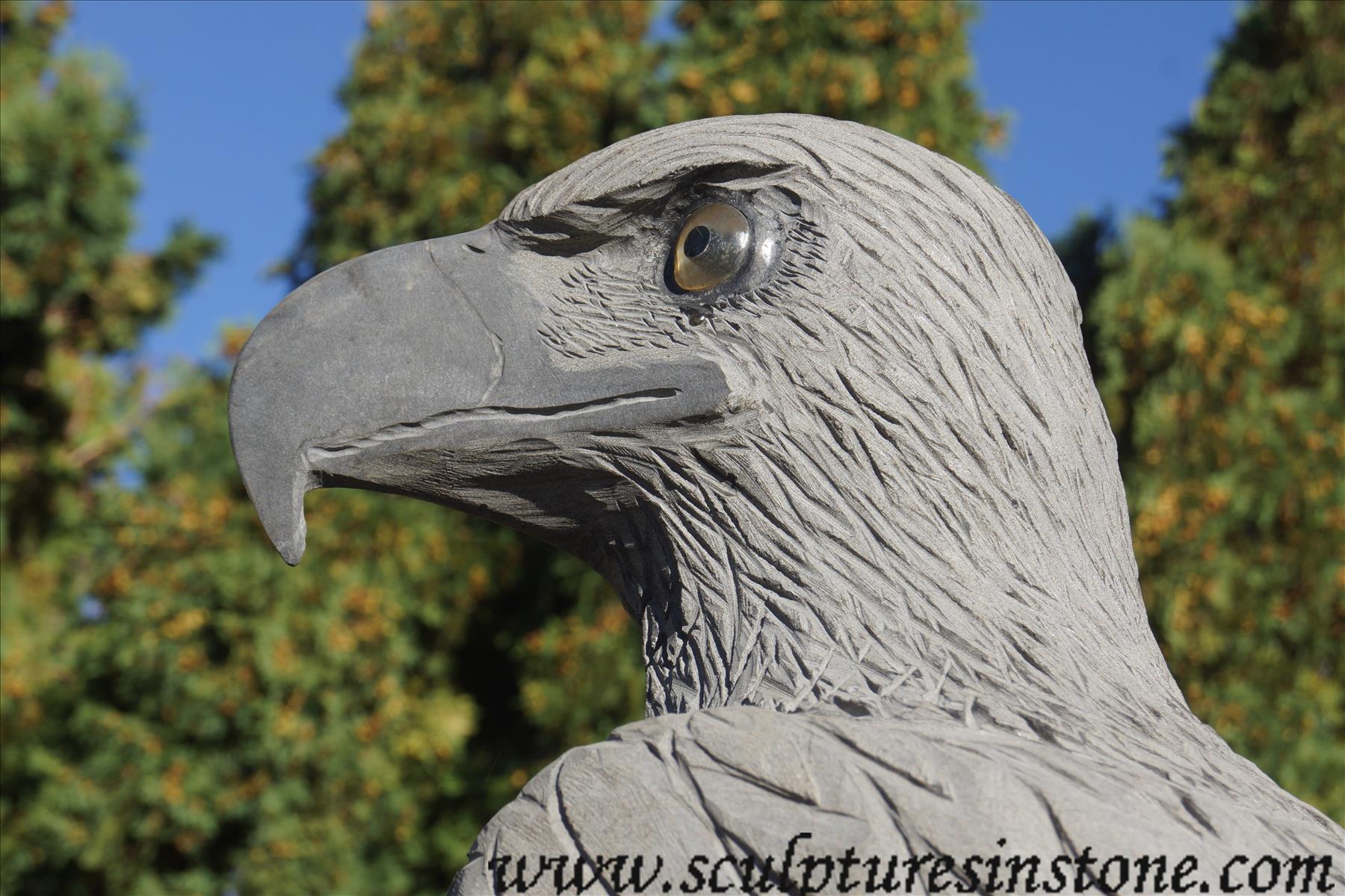 Watcher 2 Eagle Carved from Columnar Basalt Stone. Eagle eyes are made from lemon topaz and black jade pupils. Talons are carved from bronze. |